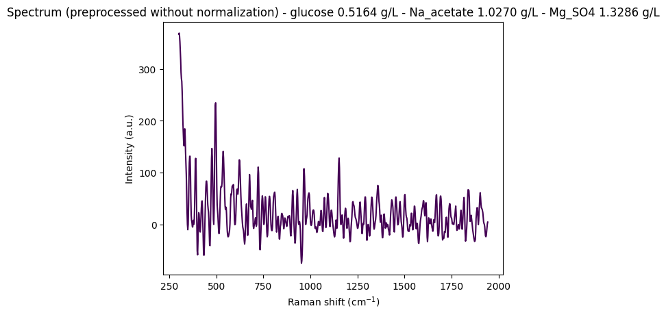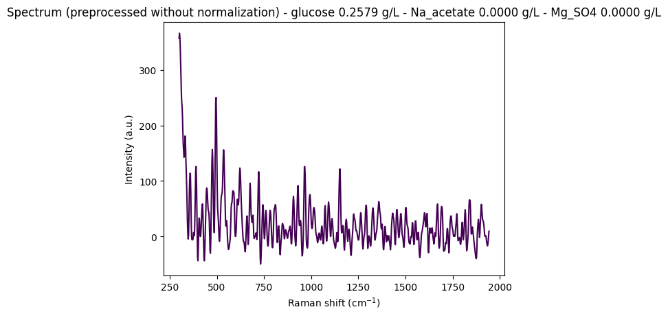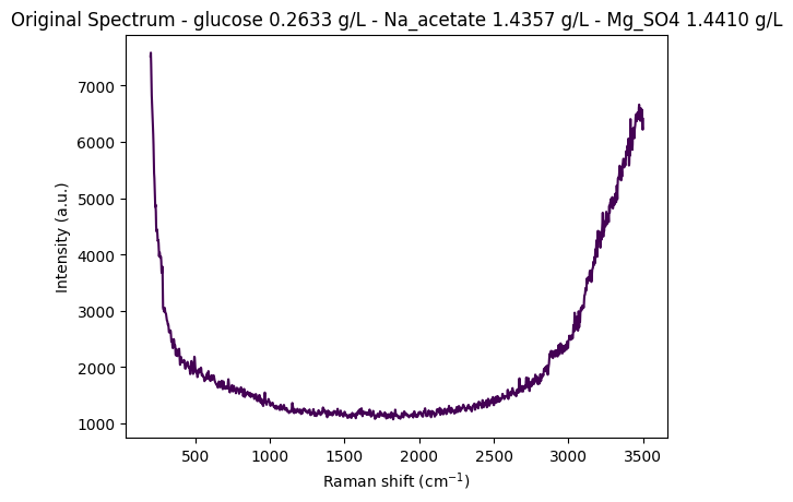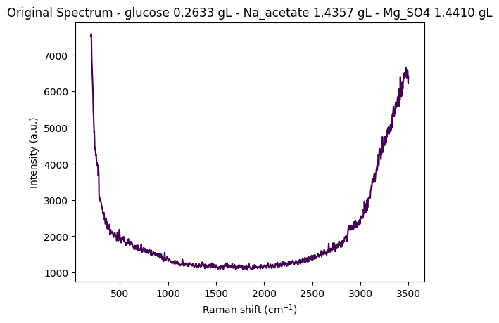 Figure 1: Example Raman spectrum from the Kaiser dataset showing characteristic peaks for glucose, sodium acetate, and magnesium sulfate. Peak locations are based on literature values. Sample concentrations: glucose 10.59 g/L, sodium acetate 1.11 g/L, and magnesium sulfate 3.48 g/L. (Lange et al. 2025, fig. 1)
