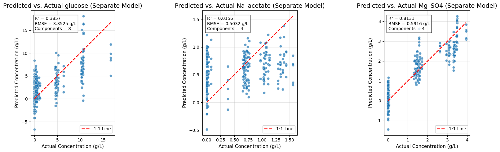 Independent optimization is beneficial: Different targets require different numbers of components (8 for glucose vs. 4 for Na_acetate and Mg_SO4), demonstrating that separate models allow for better hyperparameter tuning tailored to each compound’s spectral characteristics.