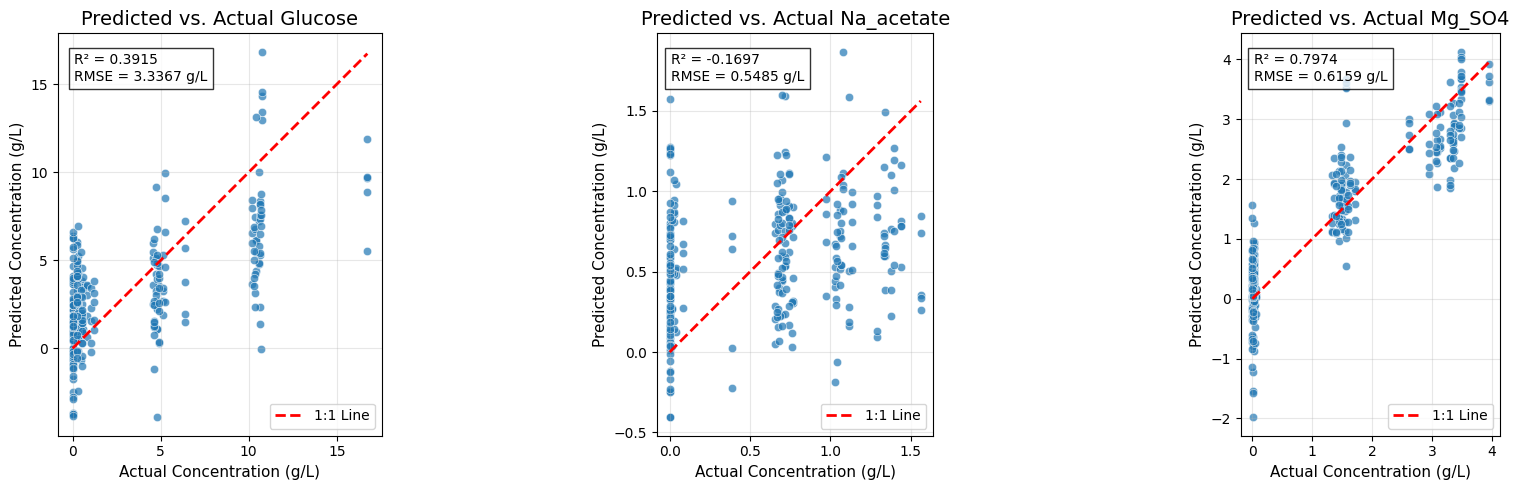 Na_acetate shows poor performance (R² ≈ 0.02), indicating weak or overlapping spectral features that may require additional preprocessing, feature selection, or alternative modeling approaches.